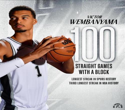 与此同时,本场比赛也是文班生涯连续第100场比赛送出封盖,成为NBA历史上第三位做到这一壮举的球员,前两人分别是尤因(145场)和穆托姆博(116场)。